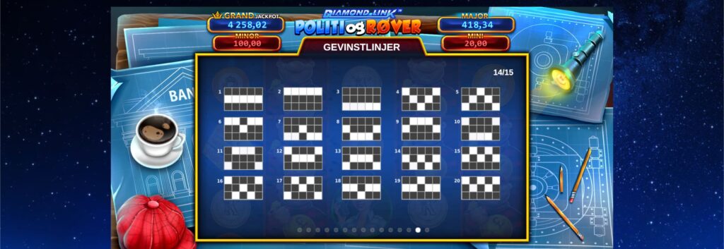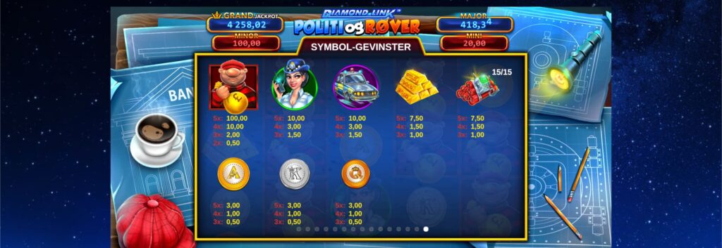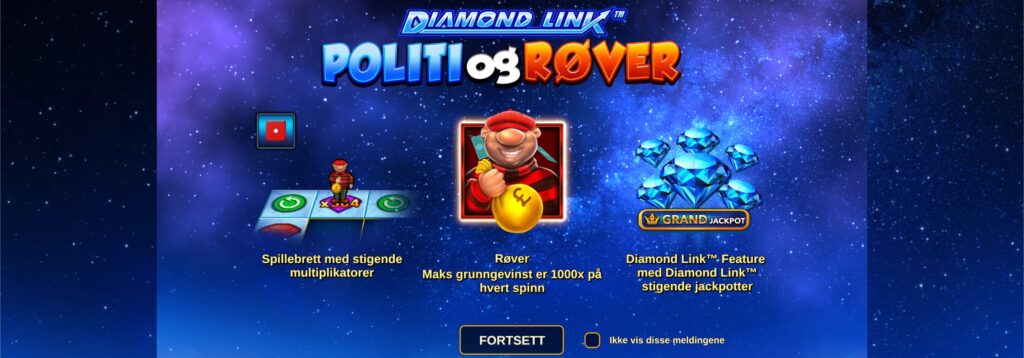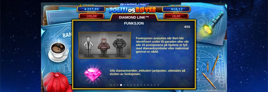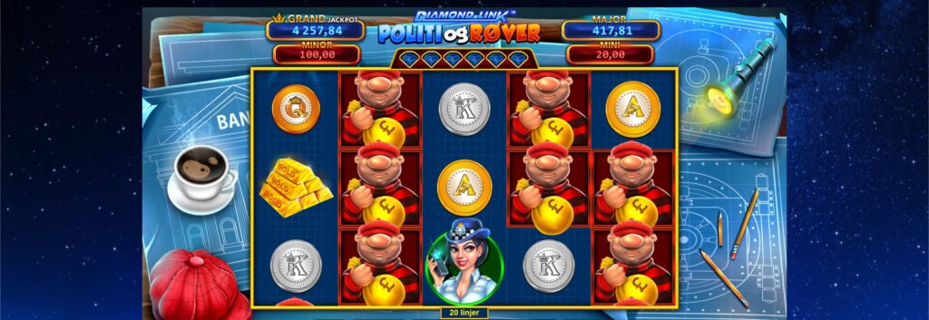 Diamond Link: Politi og Røver har 5 hjul og 20 gevinstlinjer. Maks gevinst i spillet hos KongKasino fra Norsk Tipping er rundt 100 000 kr. Maks gevinst i spillet hos norske casinoer på nett er rundt 1 000 000 kroner. Spillet har jackpot og spilleren kan ikke påvirke utfallet.