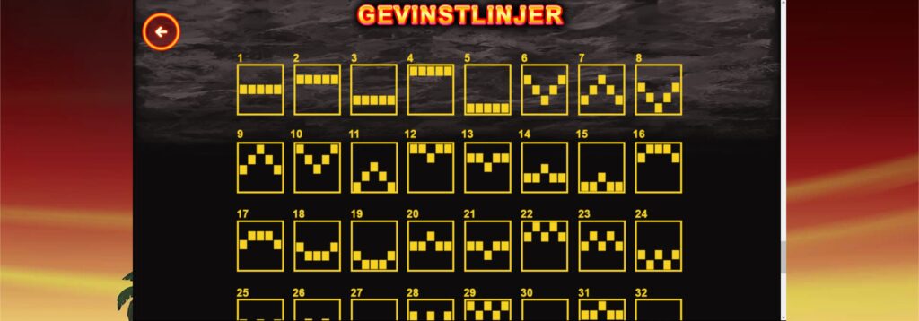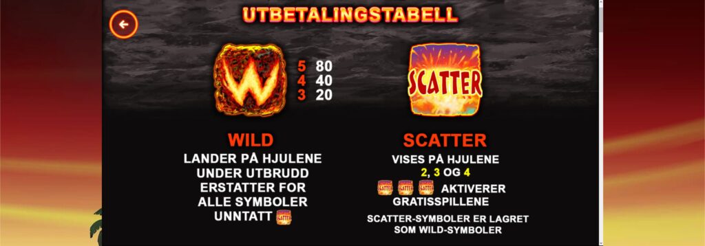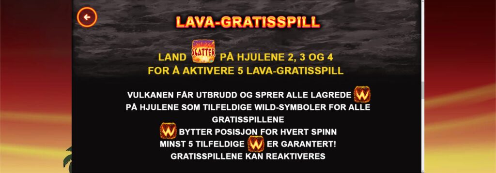 - 5 Lava-gratisspill aktiveres når et SCATTER-symbol lander på hjulene 2, 3 og 4. Alle WILD-symboler samlet under vanlig spilling blir til festede WILD-symboler under Lava-gratisspillene.
