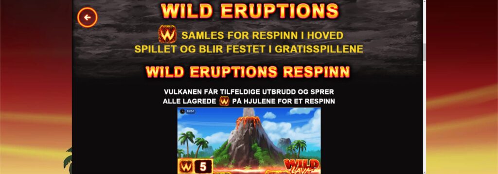 - Vulkanen får tilfeldige utbrudd i hovedspillet, og sprer alle lagrede WILD-symboler på hjulene for et respinn.