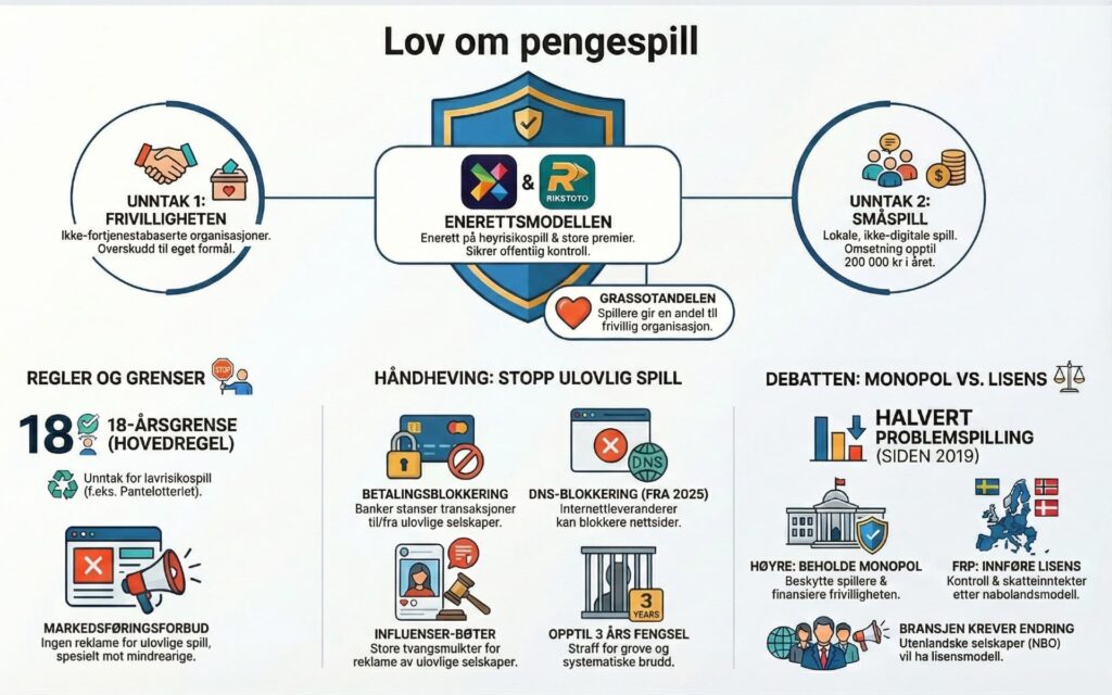 Pengespilloven regulerer alt fra Norsk Tippings monopol til lokale basarer og influensere på sosiale medier. Her får du en grundig gjennomgang av lovverket, det politiske spillet i kulissene, og hva reglene betyr for deg i praksis.