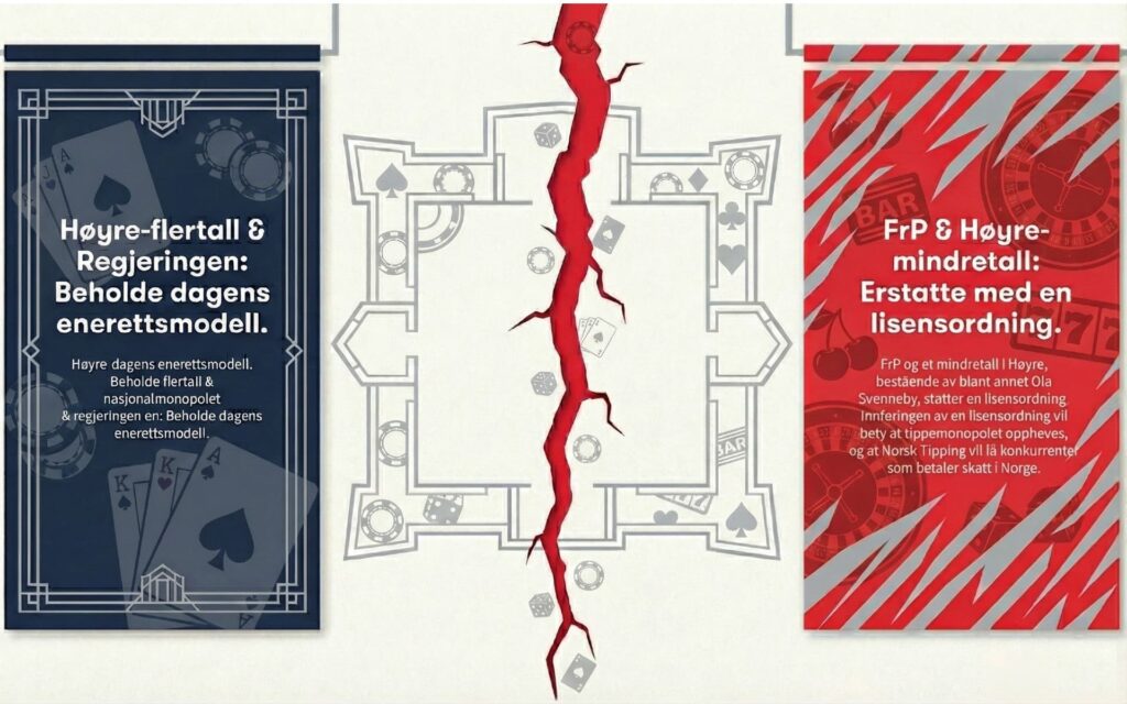 Bare uker etter Høyres landsmøte vedtok FrP på sitt landsmøte i mai 2025 å åpne for kasino og pokerklubber i Norge og å erstatte enerettsmodellen med en lisensordning, etter mønster fra Danmark og Sverige. FrP begrunnet linjen med kanalisering (få spill under norsk kontroll og beskatning) og frihet for voksne spillere, mens kritikerne pekte på risiko for økt problemspilling og reklamekappløp hvis markedet liberaliseres.