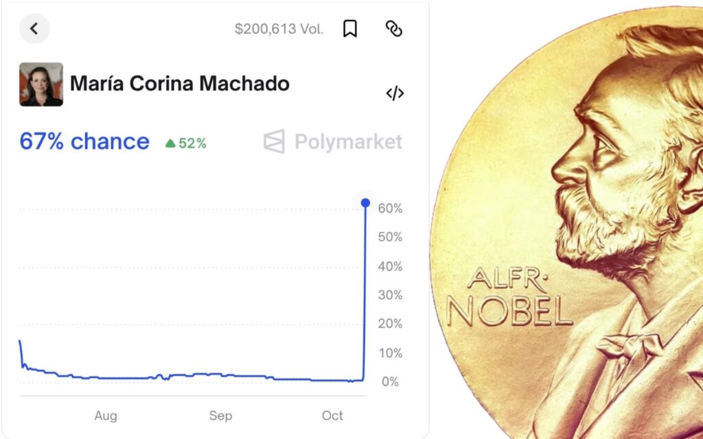 Bare elleve timer før Nobelkomiteen offisielt kunngjorde at Maria Corina Machado hadde vunnet fredsprisen, begynte én enkelt kryptolommebok å satse ekstremt tungt på seier for Maria Corina Machado. Oddsene lå da på rundt 8 cent, altså under 10 % sannsynlighet, men i løpet av få timer pumpet traderen inn over 400 000 dollar (tilsvarende ca. 4 millioner kroner) og løftet oddsen til nesten 100%.